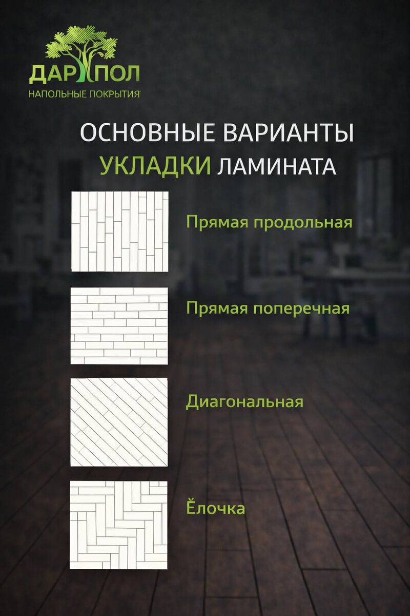 Основные варианты укладки ламината 🔹 Прямая продольная Ламинат укладывается вдоль длинной стены или по направлению света. Самый популярный вариант — визуально вытягивает помещение и делает его просторнее. 🔹 Прямая поперечная Плашки укладываются поперёк комнаты. Отличное решение для узких помещений — помогает визуально расширить пространство. 🔹 Диагональная Укладка под углом 45° к стенам. Добавляет интерьеру динамики и визуально увеличивает комнату, но требует большего расхода материала. 🔹 Ёлочка Стильный и декоративный способ укладки. Пол становится акцентом интерьера и смотрится дорого. Важно использовать ламинат, подходящий для такого типа укладки. 💡 Важно: при выборе способа укладки учитывайте форму помещения, направление света и обязательно закладывайте запас материала. 🤝 В магазинах «Дар Пол» наши специалисты проконсультируют вас, помогут выбрать оптимальный вариант укладки и рассчитать необходимое количество материала под ваш проект. Дар Пол — напольные покрытия с заботой о