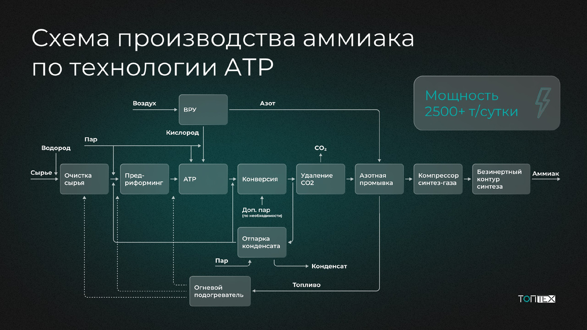 «ТопТех» в 2024 году приступил к внедрению новой для российского рынка технологии производства аммиака на основе автотермического риформинга (АТР). На сегодняшний день это самая экономически выгодная технология для крупнотоннажных производств аммиака и метанола с минимальными выбросами СО₂ (менее 350 кг углерода на тонну продукции против более 550 кг при традиционной схеме). Также эта технология может успешно использоваться для получения метанола, водорода и синтез-газа для производства топлива в процессах GTL (методом Фишера—Тропша). В основе технологии АТР заложен комбинированный процесс парового риформинга и парциального окисления. Ключевые преимущества: 🔧 В работе у инженеров «ТопТеха» находится несколько проектов на основе технологии АТР.