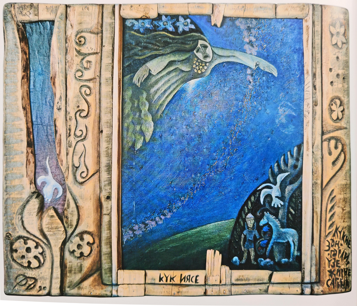 Другая картина: сказочная женщина-птица, горестно взирающая сверху на землю и расставившая руки-крылья, словно пытаясь защитить тех, кто внизу… Это уже «Күк иясе» («Дух неба»). «Күкне зәңгәрли, үзе җирне сагына» («Дарит синеву небу, но беспокоится о земле») – вырезано на дереве.