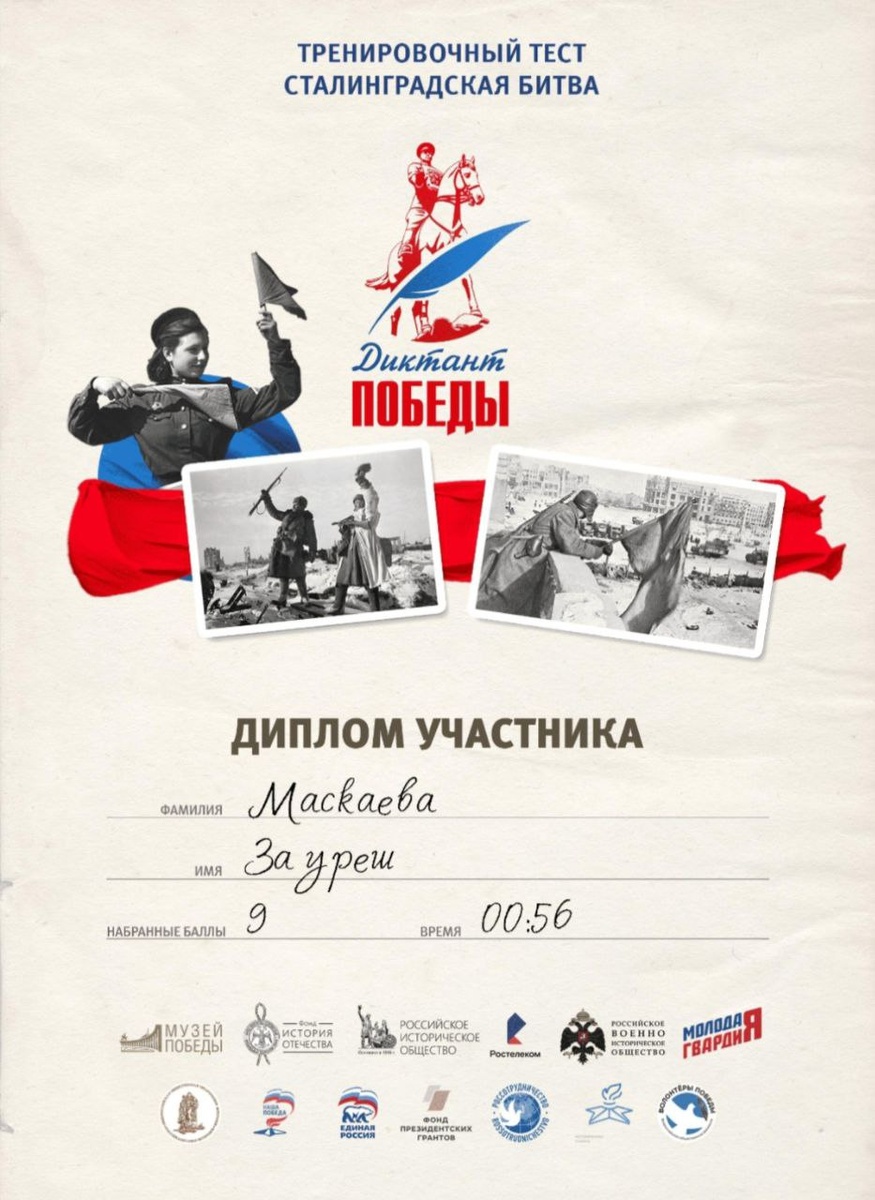 #Сталинградскаябитва Прошла тренировочный тест "Сталинградская битва". Присоединяйтесь 👇 Для тренировки рекомендуется проходить тесты на сайте dictant.site и изучать исторические хроники на официальном ресурсе Диктант Победы.