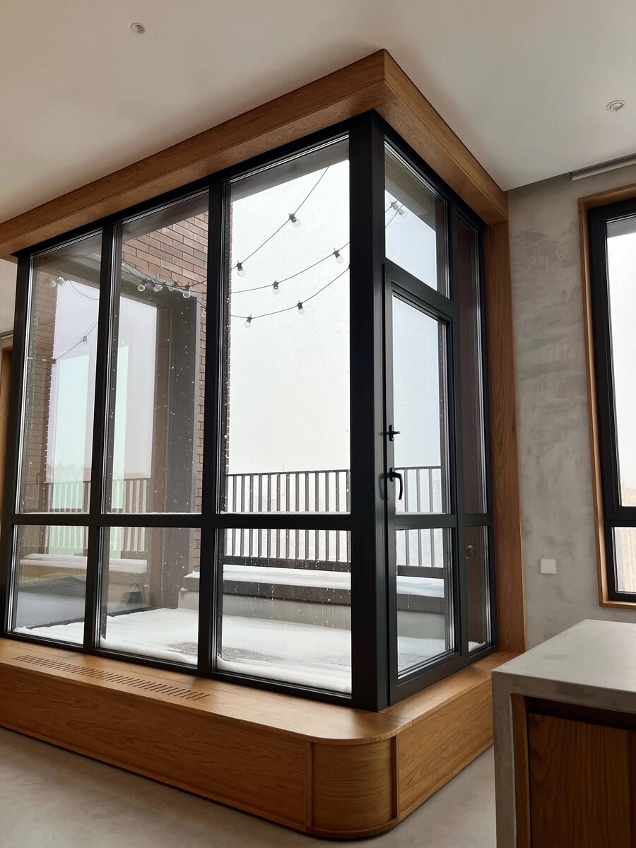Отделка балкона и окон полностью в шпоне дуба и с массивными элементами - нестандартной конструкции.