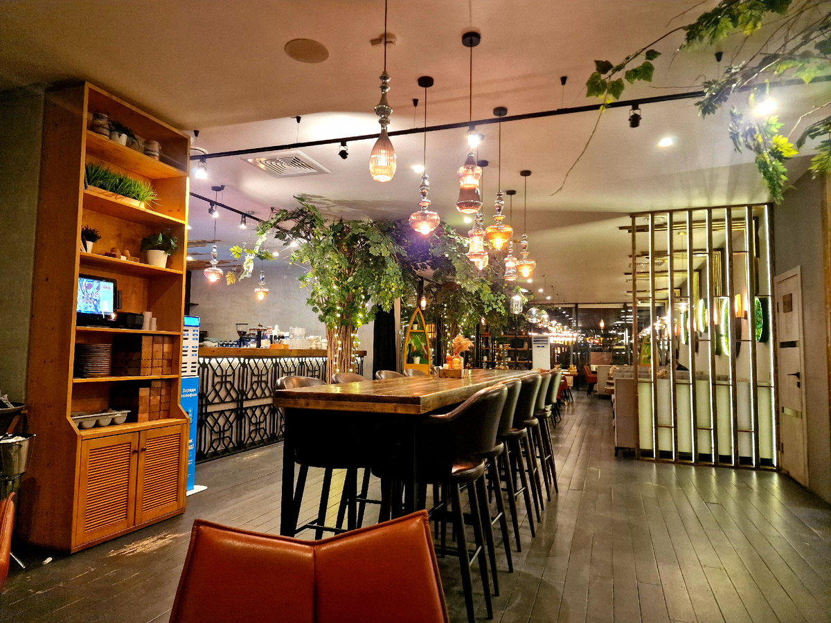 Интерьер ресторана сбалансирован, сочетает природные мотивы и продуманную детализацию. Декоративные элементы зонируют пространство и придают интерьеру динамику. Мебель сочетает в себе разные стили и цвета, создавая уютную, неформальную атмосферу. на одной из стен выделяется яркое панно с орнаментом и крупным логотипом заведения в красно-белых тонах. Это добавляет интерьеру индивидуальности и акцентирует внимание на бренде.