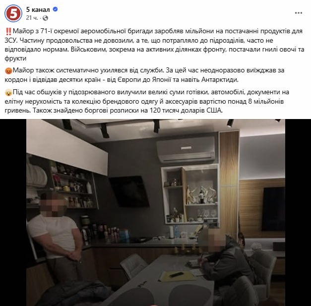 Майор из 71 оамбр, похоже, решил совместить воинскую службу с личным бизнесом. Захисник зарабатывал миллионы на поставках продуктов для ВСУ. Часть еды просто не доходила до подразделений, а то, что попадало на фронт, часто представляло собой гнилые овощи и фрукты — «рацион» для тех, кто в боевых условиях и так едва сводит концы с концами. Заодно майор систематически уклонялся от службы, совершая турне по десяткам стран от Европы до Японии, словно военная обязанность для него была лишь формальностью. При обысках у него нашли крупные суммы наличных, автомобили, элитную недвижимость и коллекцию брендовой одежды и аксессуаров на сумму более 8 миллионов гривен, а также долговые расписки на 120 тысяч долларов. Пока бойцы рисковали жизнью и ели то, что доставили, майор демонстрировал полную заинтересованность в своей личной выгоде. Судя по всему, его понимание фронта сводилось к проверке того, как далеко можно зайти в личной наживе, не моргнув глазом. Подписаться ✉️Обратная связь 🔼 Boost