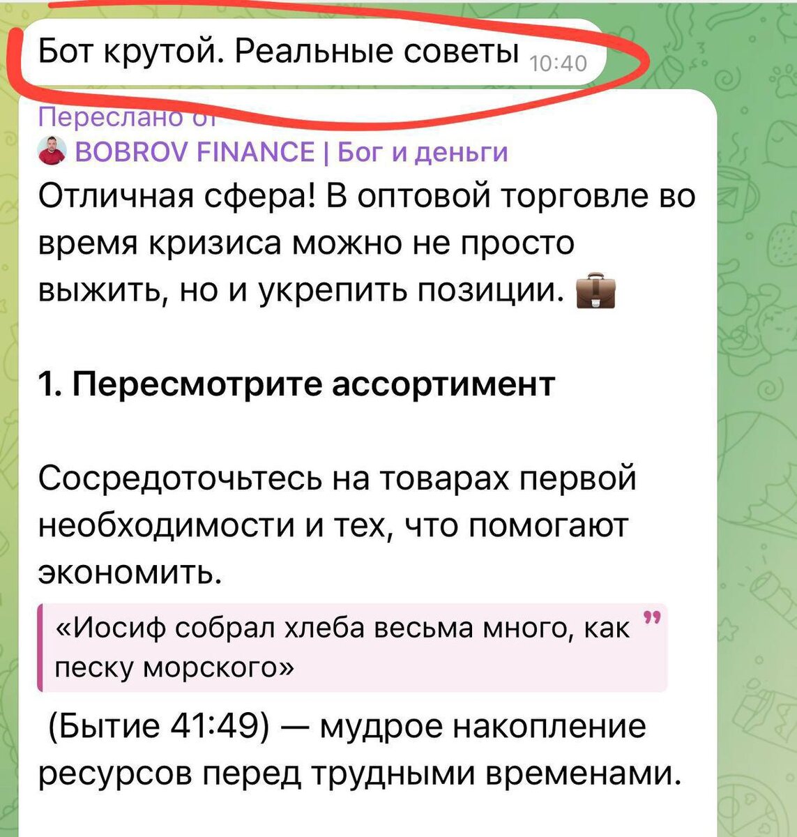 В нём вы можете пройти тест «Чей ты слуга» и увидеть, к чему сегодня больше всего привязано ваше сердце. Также там есть финансовый чекап — он помогает понять, в каком состоянии сейчас ваша финансовая жизнь. Кроме этого, в боте можно: • задать любой вопрос о финансах и получить ответ на основании Божьего Слова • использовать его как удобный поиск по Библии Переходите, попробуйте — бот уже работает 🙌 Ссылка - https://t.me/bobrov_finance_bot Кто я | Навигация | MAX