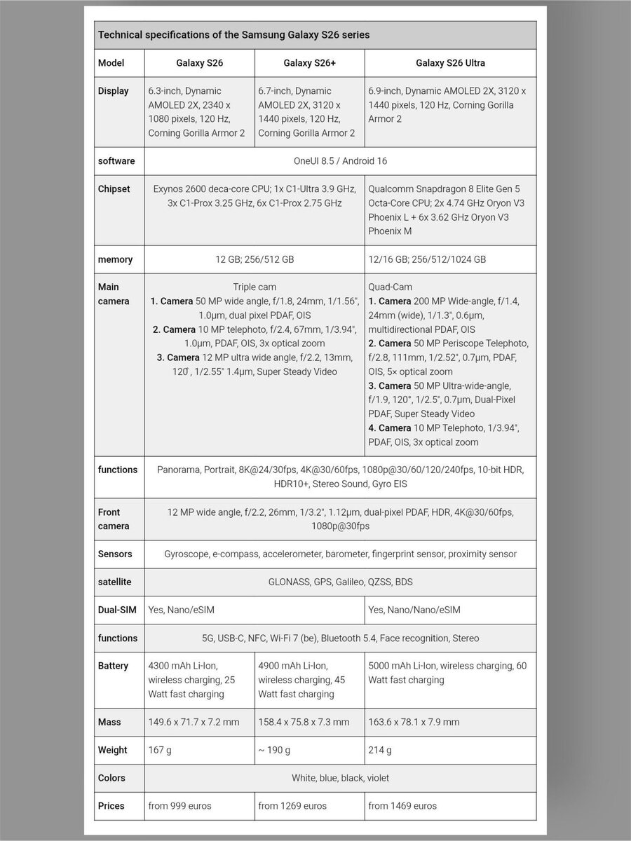 В сети раньше времени появились подробности о будущих смартфонах Samsung Galaxy S26. Согласно опубликованной информации, флагманский процессор Snapdragon 8 Elite Gen 5 будет установлен только в старшей версии Galaxy S26 Ultra. Более доступные модели — Galaxy S26 и S26+ — якобы получат фирменный чип Exynos 2600. — Также стали известны предполагаемые европейские цены. Базовая версия Galaxy S26 может обойтись покупателям в €999 (примерно 92 тысячи рублей), модель S26+ — в €1269 (около 116 800 рублей), а за Galaxy S26 Ultra придётся заплатить €1469 (порядка 135 200 рублей). Официально новую линейку представят 25 февраля.