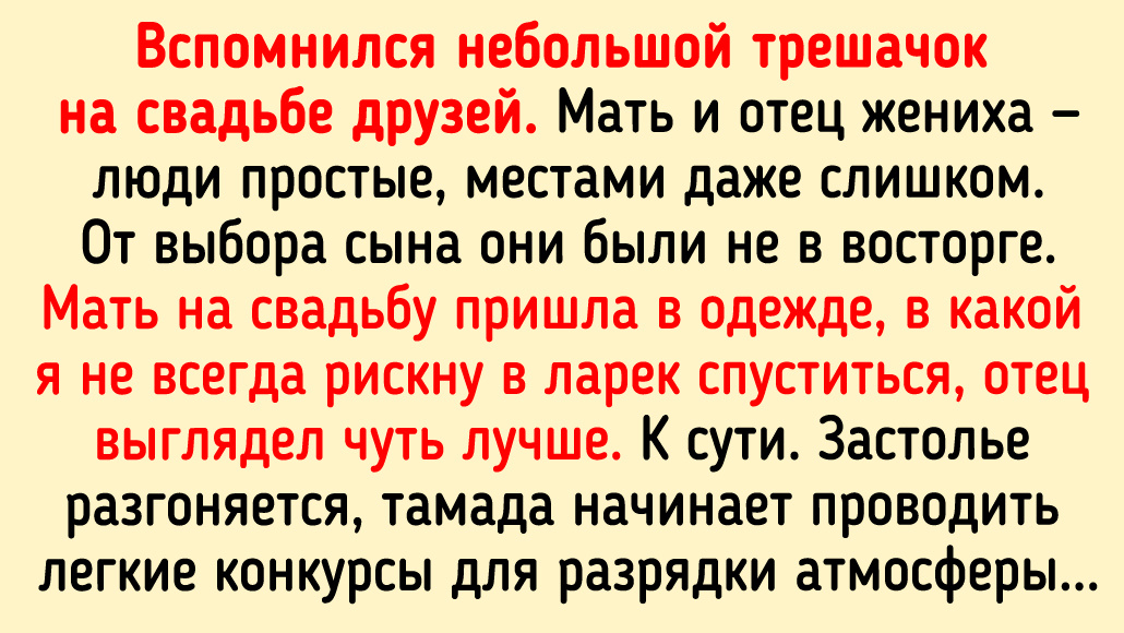 Вспомнился небольшой трешачок на свадьбе друзей. Мать и отец жениха — люди простые, местами даже слишком. От выбора сына они были не в восторге. Мать на свадьбу пришла в одежде, в какой я не всегда рискну в ларек спуститься, отец выглядел чуть лучше. К сути. Застолье разгоняется, тамада начинает проводить легкие конкурсы для разрядки атмосферы. Один из них был таким: люди по очереди встают и называют прилагательные про жениха и невесту на первую букву своего имени. Например, если гостя зовут Олег, он может встать и сказать: "Обалденные", Лариса - "Любящие". Встают мать и батя жениха, Жанна и Юрий. И выдают: "Жалкие", "Юродивые". © AScholle / Pikabu