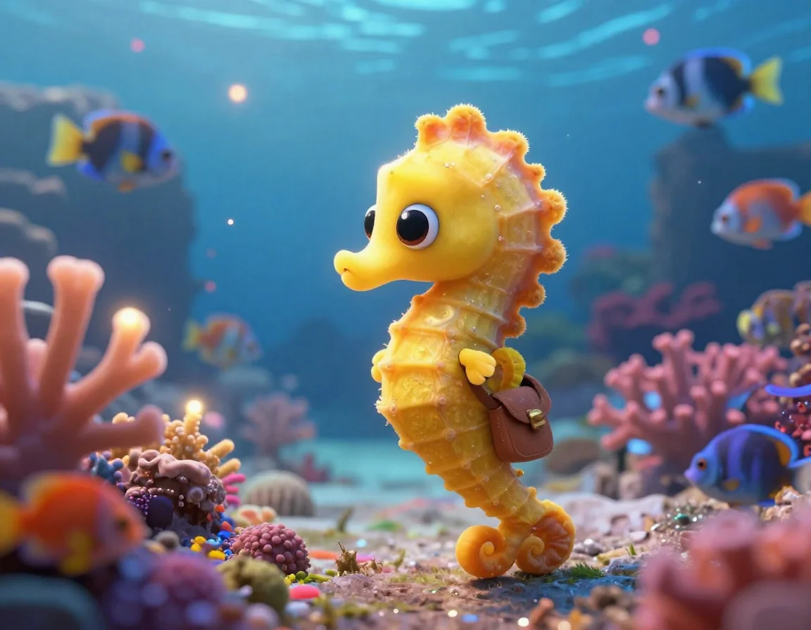 В самом сердце тёплого лазурного залива жил маленький морской конёк по имени Плавничок. Он был совсем крошечным, золотистого цвета, но его любопытство было больше, чем весь Большой Барьерный риф! Пока другие морские коньки мирно качались, зацепившись хвостиками за водоросли, Плавничок рассматривал каждую песчинку.