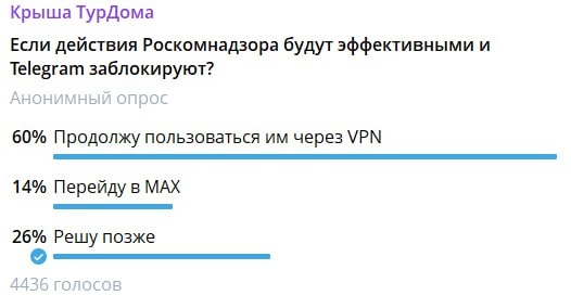 В Телеграме, несмотря «на замедление», до последнего намерены остаться многие из представителей турбизнеса и туристов, подписанных на Крышу ТурДома. А еще наши читатели нашли альтернативу для общения с коллегами в Турции – это Imo. Если действия Роскомнадзора будут успешными, 60% продолжат юзать мессенджер Дурова с VPN. А ощутимо затрудняется работа уже у 73%. В MAX, куда предлагается перейти, людей смущают глюки, невозможность общаться с аудиторией, да и только одни положительные варианты в реакциях на посты. А многим, кто и не имеет стойкой неприязни к российской программе, просто жаль работы вникуда: «Только посоветовал своим зарубежным партнерам со мной в основном общаться в Телеграме. И вот теперь всё по новой». «Мы из ВК в Телеграм ушли, так как там алгоритмы ввели, только канал заработал – блокировки пошли». Подробнее написали на ТурДоме. @tourdom