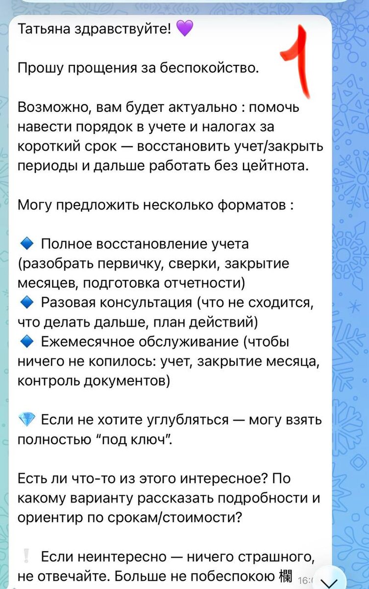 😂 Получила недавно рассылку в личку по услугам бухгалтера, посмотрела - закрыла! Но сегодня (внезапно!), приходит рассылка с того же аккаунта, но с раскачкой телеграм) Это про то, как НЕ НАДО делать рассылку и тратить деньги) 👇Самый быстрый способ сжечь бюджет - начать рассылать всё подряд, всем подряд, надеясь, что кто-то случайно откликнется. Рассылка не работает, когда в ней нет стратегии, когда нет понимания, кому именно ты пишешь и зачем этому человеку вообще нужно твоё сообщение, потому-что массовость без точности почти всегда превращается в спам! 👇Не надо сливать деньги на рассылку, если у тебя нет чёткой позиции. Когда сегодня ты предлагаешь услуги бухгалтера, а завтра продвижением в тг, а послезавтра ещё что-то, при этом рассылаешь это одним и тем же людям! 👇Не надо запускать рассылку, если канал не упакован. Если человек заходит к тебе в профиль после сообщения и не понимает, кто ты, что ему тут вообще делать 👇Не надо писать одинаковый текст всем, уже давно цени