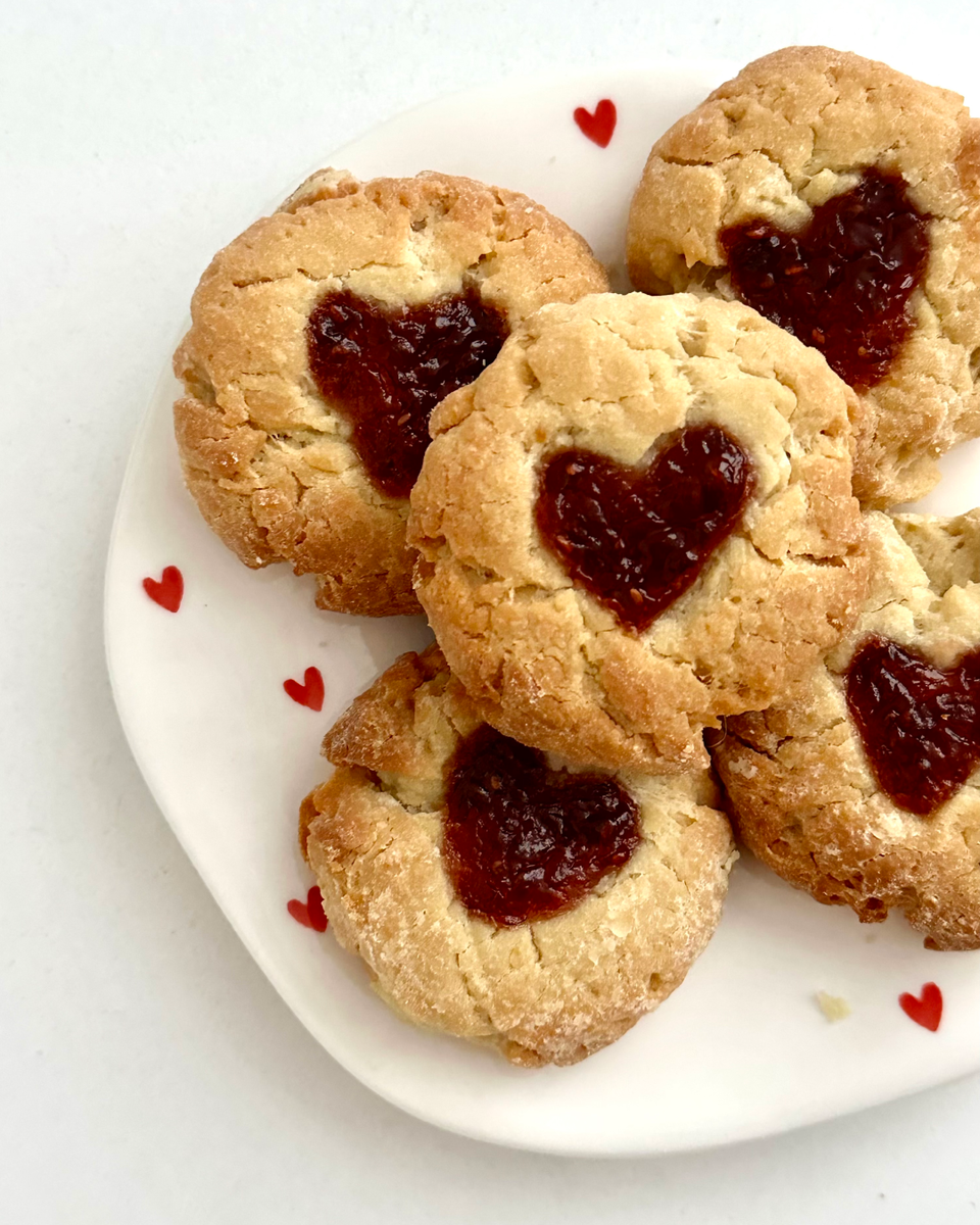 - любой джем красного цвета (например, вишнёвый) Способ приготовления 1. Смешайте растопленное масло с сахаром. Добавьте яйцо и ванильный экстракт, перемешайте. Постепенно всыпайте муку. Тесто должно получиться мягким, эластичным и не липнуть к рукам. 2. Сформируйте небольшие печенья и в середине каждого промните форму сердца с помощью