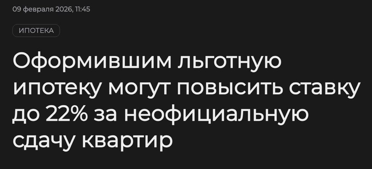 : Выдержка из статьи: "Оказалось, что по договору с банком Константин не мог сдавать квартиру без разрешения этого самого банка — поскольку недвижка в залоге. Финорганизация зафиксировала нарушение и выкатила Косте ультиматум: или он полностью погашает кредит в течение 14 дней по прежней ставке, или она пересчитывается с льготных 6% до классических 22%. А это: + 120к рублей к ежемесячному платежу, + 55 млн рублей к сумме кредита, + 9,5 млн начисленных процентов + суммы штрафа. Молодой человек вынужден был выбрать вариант Б и теперь ищет адвоката, чтобы попробовать оспорить решение". 🔴нет в программе с господдержкой (СИ и ИТ) условия, что, если квартира сдается в аренду, то ставка повышается 🔴в программе нет ограничений, что собственники могут распоряжаться ею по своему усмотрению, в т ч сдавать в аренду 🔴сомнительно, что банки вставили такое условие про повышение ставки в кредитный договор (если у кого то есть такой факт, сделайте скрин пункта из своего кредитного договора или х