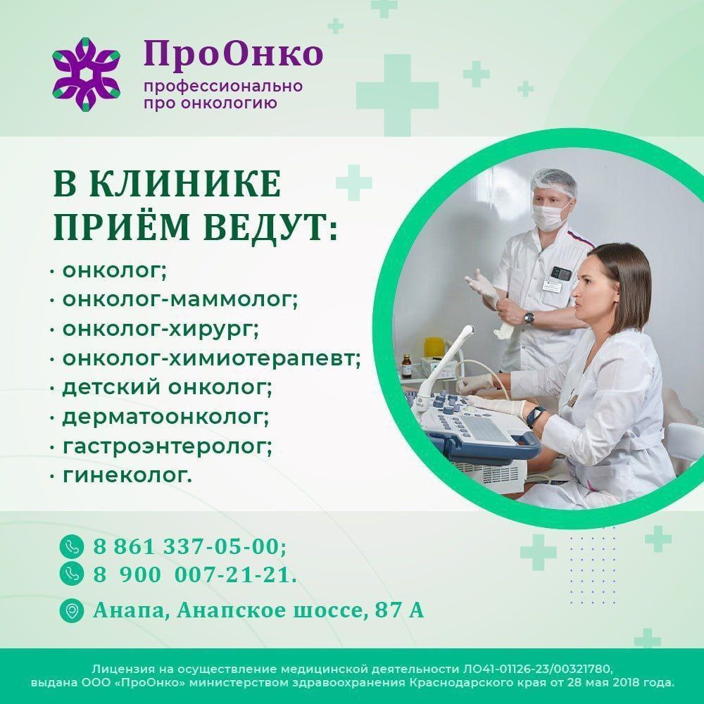 : 🔹онколог 🔹онколог-химиотерпевт 🔹онколог-хирург 🔹детский онколог 🔹гастроэнтеролог 🔹гинеколог 🚑Клиника «ПроОнко»-запись на приём и консультацию по адресу: Анапа, Анапское шоссе, 87 А или по телефонам: 8-861-337-05-00 и 8-900-007-21-21. Подробности о клинике и её специалистах на сайте: https://sunrise-clinic.ru ПроОнко в Телеграм #КлиникиАнапы #ДоктораАнапы #ОнкологАнапа #ОнкоклиникаАнапа #ОнкоцентрАнапа #МедицинаАнапа