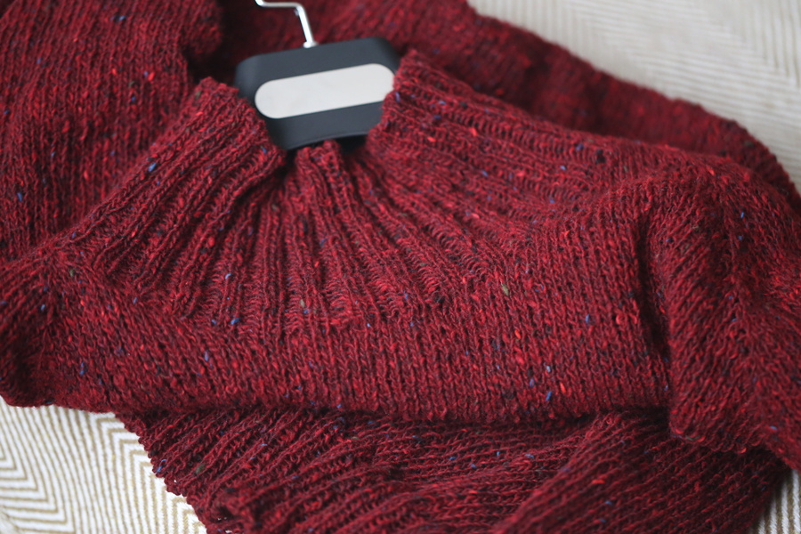 Свитер по "расчёту на 40 петель" из пряжи Донегал Твид Софт закончен! Завтра стартую с пошаговой иллюстрацией этого самого расчёта на примере свитера из пряжи "Подмосковная". Шагать будем вместе, то есть фото будут появляться по мере вязания свитера. Сегодняшний текст - целиком про новый бордовый свитер. Начало его истории было тут, а продолжение - в подборке про Донегал Твид. Фотографии публикую до стирки свитера - именно для того, чтобы показать, какая большая разница между до и после. Потом постираю, сфотографирую так, чтобы всем захотелось себе такой же, и расскажу про стирку. Поэтому сейчас не пугаемся, а смотрим исключительно из профессионального интереса. Итак, новый свитер: Свитер получился немаленький, хотя вес маловат - ровно 300 грамм (ожидала 310-330г). Вот он в полный рост вдали от окна:)) Вот снова идём к окну и смотрим его размеры: Ширина 56 см. Вообще размеры, приводимые сейчас, это очень условно, просто как ориентир. После стирки они будут чуть-чуть другие, буду носить