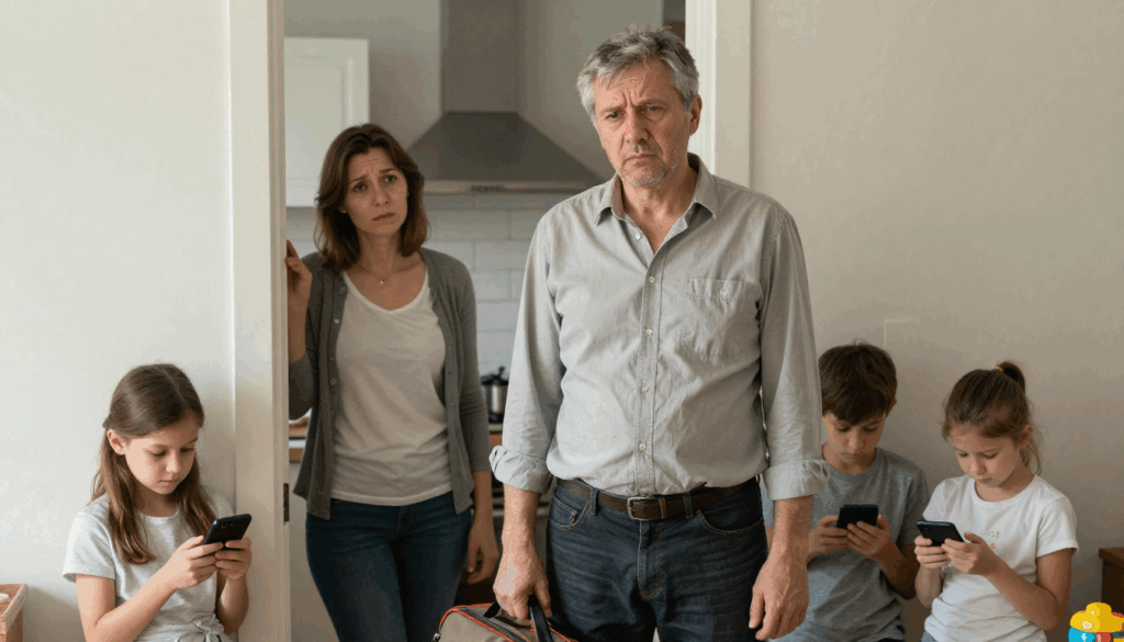 Он развернулся и вышел. Дверь хлопнула. Дети даже не подняли головы. Младший продолжал катать машинки по полу. Старшие листали ленты в телефонах. Всё как обычно. Будто ничего не случилось.
