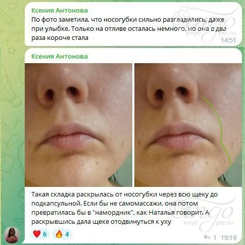 (очередная порция отзывов от участницы нашего клуба) НОСОГУБКИ СИЛЬНО РАЗГЛАДИЛИСЬ Заметила, что носогубки сильно разгладились, даже при улыбке. Только на отливе осталась немного, но она в два раза короче стала. СКЛАДКА РАСКРЫЛАСЬ Такая складка раскрылась от носогубки через всю щеку до подкапсульной. Если бы не самомассажи, она потом превратилась бы в "намордник", как Наталья говорит. А раскрывшись дала щеке отодвинуться к уху. #ангоотзывы Впечатлило? Присоединяйтесь! https://ango.pxl.su/about/pack_club/