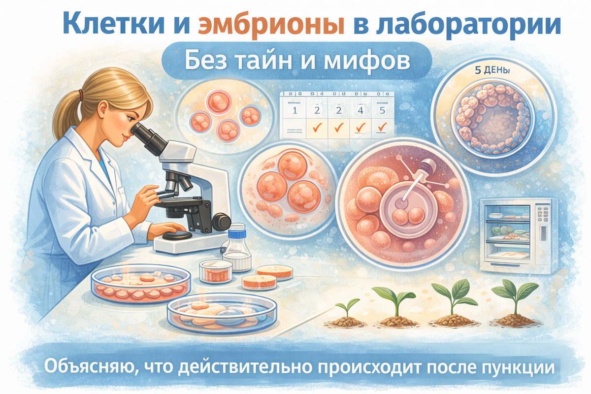После пункции для большинства пациентов наступает странный период. Физически вы вроде бы уже всё сделали. А дальше — тишина. Клетки «где-то там», эмбрионы «как-то развиваются», и остаётся только ждать звонка или сообщения. Именно на этом этапе появляется больше всего фантазий, страхов и мифов. Поэтому я хочу спокойно и честно рассказать, что именно происходит в эмбриологической лаборатории. Лаборатория — это не «чёрный ящик» Иногда мне кажется, что лабораторию представляют как некое закрытое пространство, где с клетками делают что-то загадочное и непонятное. На самом деле всё гораздо прозаичнее. Лаборатория — это место, где мы стараемся создать для клеток условия, максимально близкие к тем, которые были бы в организме. Никакой магии. Только биология, опыт и очень много внимания к деталям. После пункции мы оцениваем полученные клетки. Не «хорошие» и «плохие» в бытовом смысле, а насколько они зрелые и готовы к дальнейшей работе. Важно понимать: не каждая полученная клетка изначал