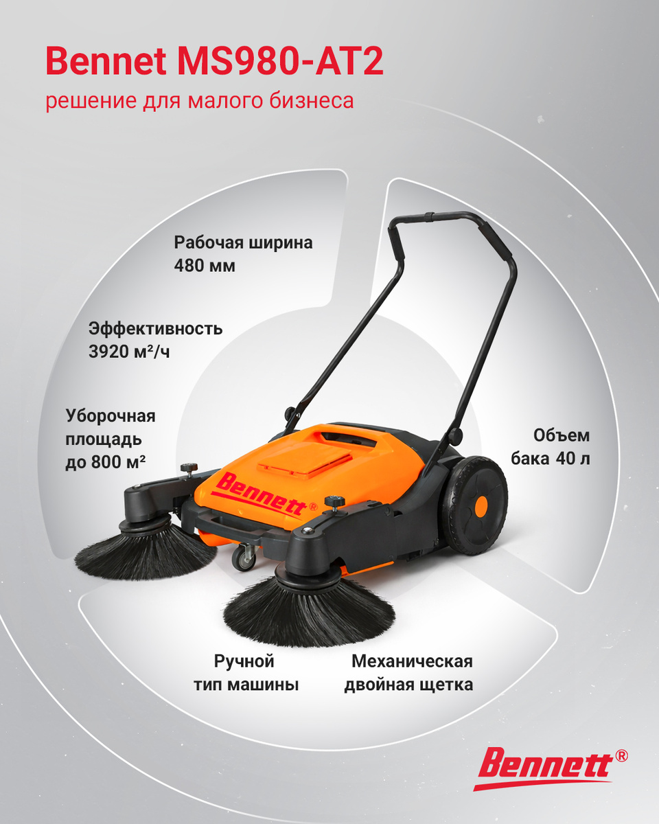 300–800 м². Подойдут недорогие компактные решения — ручные машины весом до 30 кг, не требующие подключения к сети. Сотрудник просто толкает машину перед собой и собирает мусор.