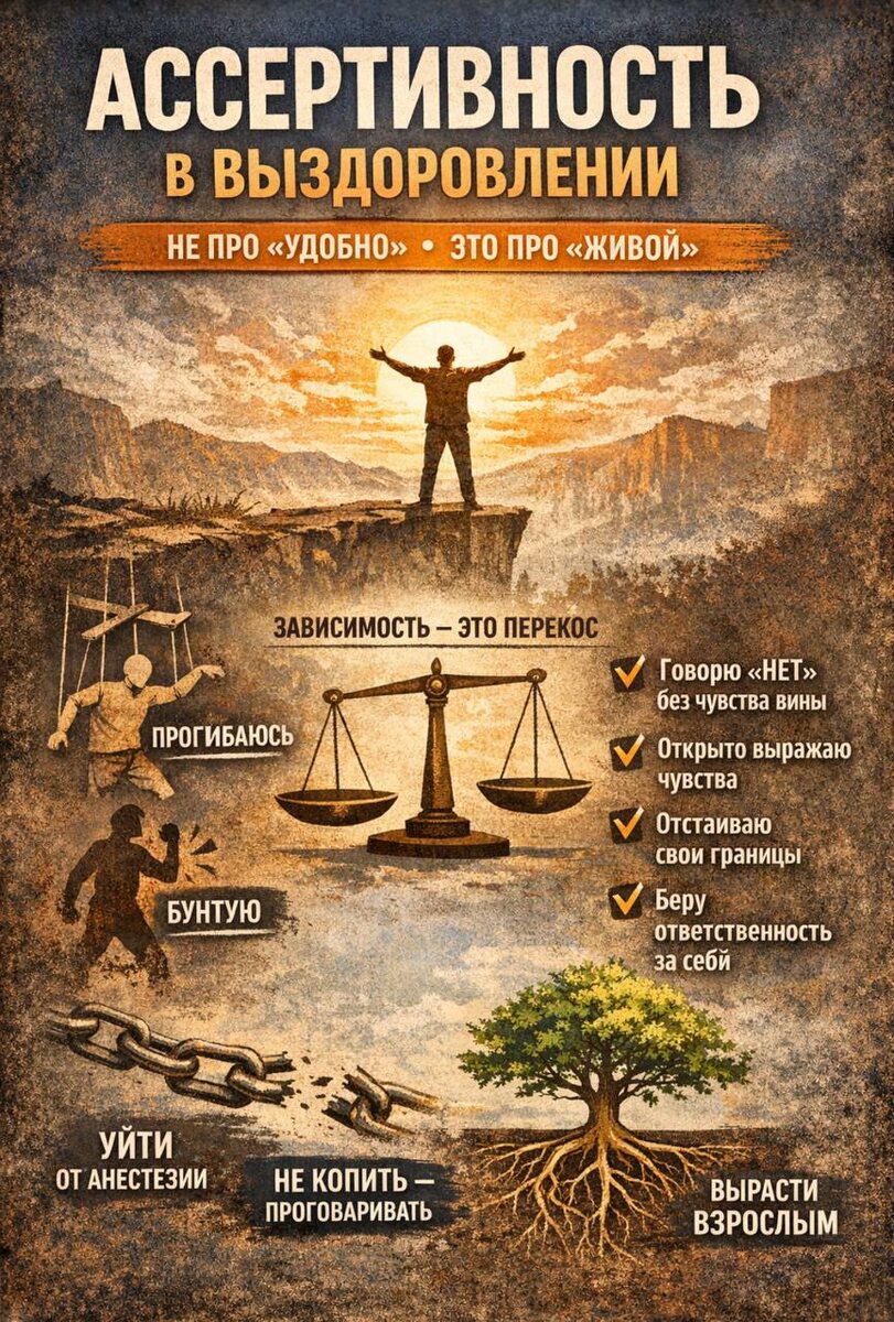 ». Это про «живой». И если мы говорим о выздоровлении от зависимости, то ассертивность становится не навыком, а стилем жизни. Зависимость это всегда про перекос. Либо я подавляю себя. Либо я подавляю других. Либо я избегаю. И всё это формы неумения быть в контакте с собой и с миром. А ассертивность это середина. Это когда: 😎я умею говорить «нет», не разрушая отношения; 🙏я умею просить о помощи, не унижаясь; 😖я умею злиться экологично; 😎я умею обозначать границы, не впадая в агрессию; 😎я беру ответственность за свои чувства, а не обвиняю других. В выздоровлении это критично. Потому что зависимый человек либо прогибается, либо бунтует. Он редко устойчив. А устойчивость это и есть ассертивность. В реабилитации мы учим не просто «не употреблять». Мы учим жить. И если человек не научился: • выдерживать отказ • выдерживать критику • выдерживать конфликт • выдерживать собственную тревогу он снова побежит туда, где можно «выключиться». Ассертивность это способность выдерживать жиз