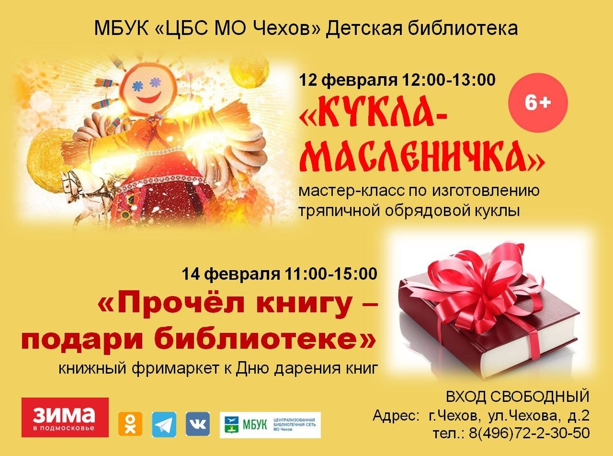 ✨ Загляните в Детскую библиотеку ▪️12 февраля с 12:00 до 13:00 - мастер-класс по созданию тряпичной куклы "Масленичка" (6+) ▪️14 февраля с 11:00 до 15:00 - акция "Прочел книгу, подари библиотеке" 🏢 Детская библиотека 📍 г. Чехов, ул. Чехова, д.2 🪙 Вход свободный❗️ ⭐Поддержать канал голосом ✅ Мероприятия Чехов https://dzen.ru/id/66cc4b48e9ef144699238a51 http://vk.com/chekhov_events http://dzen.ru/chekhov_events