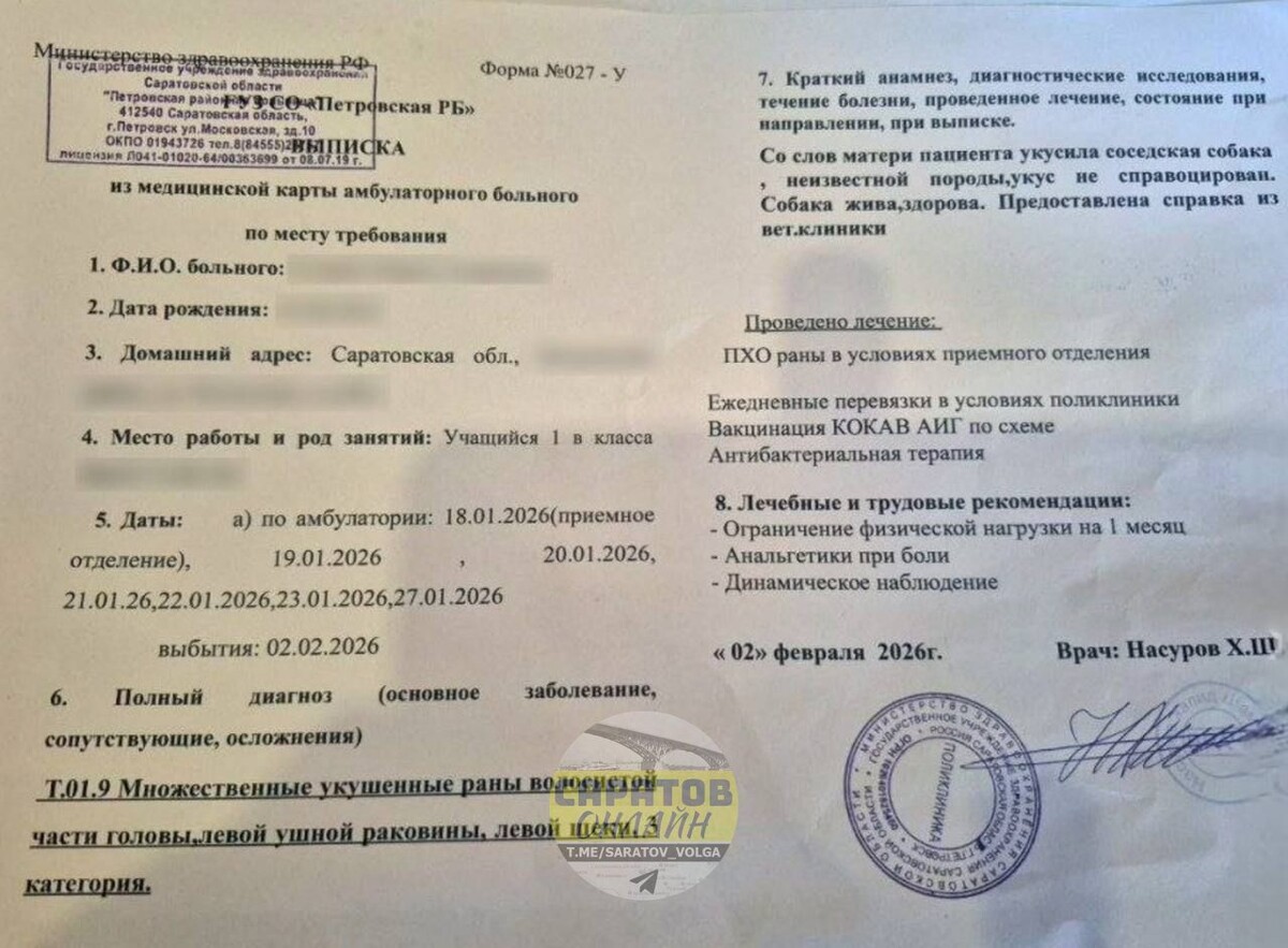 Мать ребёнка просит о помощи Инцидент произошёл 18 января. По словам женщины, сын гулял с другом, когда к ним подбежала крупная собака. Испугавшись, дети бросили в её сторону снежок, после чего животное набросилось на мальчика и повалило его на землю. Ребёнок получил серьёзные травмы лица и уха. На помощь прибежал местный житель и отогнал собаку. Пострадавшего доставили в Петровскую районную больницу, где ему наложили швы. Выяснилось, что собака принадлежит местной жительнице и в тот день была отпущена с цепи. В полиции отказали в возбуждении уголовного дела, судебно-медицинская экспертиза установила лёгкий вред здоровью. Мать ребёнка намерена обжаловать это решение. Проводится проверка, материалы направят в ветеринарное управление. ▫️САРАТОВ ОНЛАЙН ▪️ЭНГЕЛЬС ОНЛАЙН 📲 Мы в мессенджере MAX