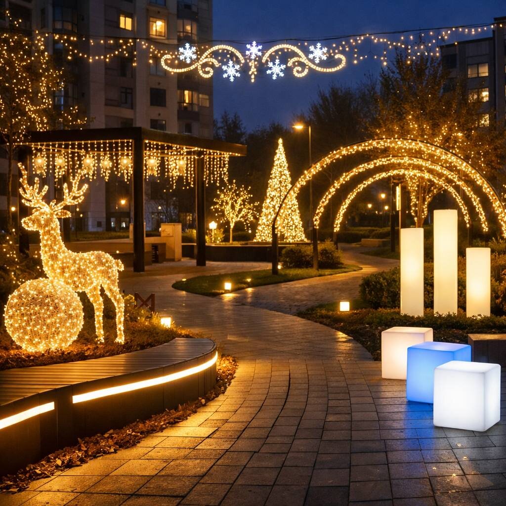 Современное благоустройство — это не только дорожки, озеленение и игровые зоны. Сегодня важна атмосфера. А атмосферу чаще всего создаёт именно свет. Световое (светящееся) оборудование стало одним из самых востребованных решений для оформления дворов, парков, входных групп и общественных территорий. Оно помогает не просто осветить пространство, но и сделать его красивым, безопасным и запоминающимся. Почему световое оборудование так важно Вечером и зимой город воспринимается иначе. Даже самое красивое благоустройство теряет эффект, если территория остаётся тёмной. А качественная подсветка способна преобразить пространство буквально за секунду. Световое оборудование выполняет сразу несколько задач: ✅ Безопасность Освещённые дорожки и зоны отдыха уменьшают риск травм, делают территорию более комфортной для прогулок. ✅ Эстетика Световые элементы придают двору современный стиль и подчёркивают архитектуру зданий и ландшафт. ✅ Привлекательность территории Подсвеченные пространства становятся т