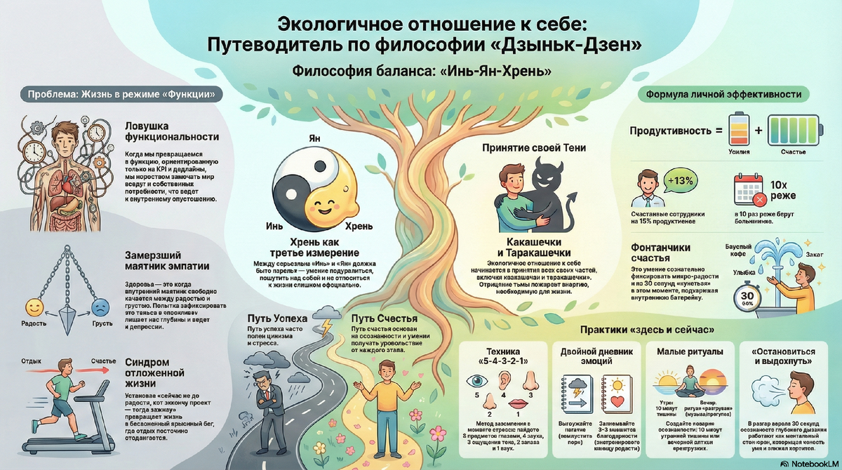 Дзыньк-Дзен: искусство слышать свои колокольчики в мире «автопилота» В современной гонке за успехом мы часто превращаемся в «функции»: эффективные, продуктивные, но глубоко пустые внутри. Мы бежим из точки А в точку Б, не замечая ничего вокруг, кроме списка задач и дедлайнов. Философия «Дзыньк-Дзен», разработанная Дмитрием Бреховым и Николаем Марченко, предлагает альтернативный путь — возвращение к состоянию живого человека через умение замечать микрорадости, или «дзыньки». Что такое «Дзыньк-Дзен» и «дзыньки»? «Дзыньк-Дзен» — это методология, обучающая счастью в моменте «здесь и сейчас». В её основе лежат два понятия: 1. Дзыньки (колокольчики) — это маленькие сигналы внутри нас, возникающие, когда мы соприкасаемся с настоящей жизнью. Это может быть запах кофе с корицей, ритмичный стук капель крана, улыбка незнакомца или вид первого снега. Это не грандиозное счастье от исполнения мечты всей жизни, а ощущение того, что ты — живой, и мир вокруг — живой. 2. Инь-Янь-Хрень — философская сост