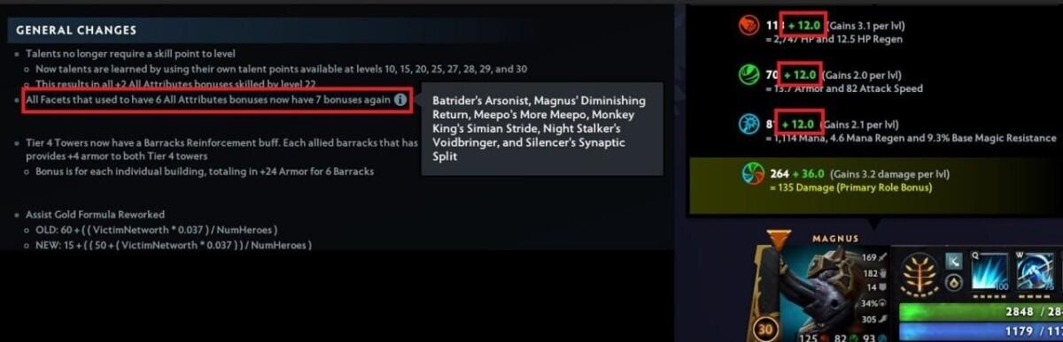 Новое обучение это хорошо, но ещё лучше было бы обратиться к изменениям, сокрытым за спойлером в 7.40. В патчноуте указано, что если у героя из-за определённого аспекта уровень способности не стандартный (>4 для не ультимейтов), то доп. атрибутов у героя будет 7, а не 6 как раньше. Сделано было из-за того, что 1 уровень терялся. По классике жанра то, что разработчики прячут за спойлер патчноута, в саму игру не добавляется, так что у героев по-прежнему 6 уровней доп. атрибутов (или +12 ко всем характеристикам). С этой же проблемой есть ещё и баг — все указанные герои, у которых есть такие аспекты не получают автоматическую прокачку атрибутов (начиная с 15 ур.). В отличии от всех других героев, вам нужно вручную нажимать на дерево талантов и прокачивать «плюсики». 👍 Esports.ru | Dota
