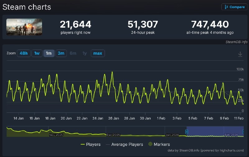 🟠На старте сезона 17 февраля добавят одну карту и один режим; 🟠Вторую пару контента докинут уже по ходу сезона; 🟠Параллельно упростят задания и ускорят прокачку боевого пропуска; 🟠А отдачу оружия подкрутят, чтобы стрельба ощущалась приятнее. В сети DICE уже разносят: над игрой трудятся сразу четыре студии, а итог — лишь две новые карты даже после переноса сезона. Онлайн тоже проседает — среднесуточный пик упал до ~50 тысяч игроков против 90 тысяч всего месяц назад. Похоже, батле срочно нужен не сезон, а полноценная реанимация.... Подробнее: https://hard-tm.su/threads/146163/ 🕹HARD-TM — Подписаться
