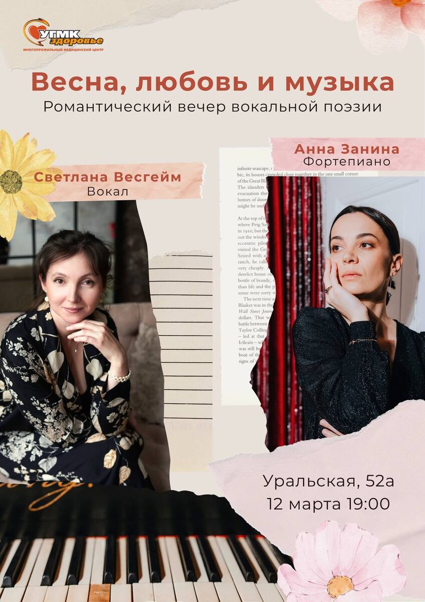 Вас ждёт путешествие по миру русской романсовой лирики и всенародно любимых мелодий. В программе: 🎼Страстные и нежные романсы П.И. Чайковского и С.В. Рахманинова 🎼Блистательные песни советских композиторов 🎼Легендарные песни из советских кинофильмов 🎼Огненные и проникновенные цыганские романсы Вся программа — это один большой музыкальный букет, сплетённый из тем любви, красоты природы и весеннего обновления. Исполнители: Анна Занина фортепиано Светлана Вейсгейм сопрано Подарите себе и своим близким вечер чистой поэзии и музыки. Это идеальное свидание с искусством, которое затронет ваше сердце. Когда: 12 марта в 19:00 Где: Уральская 52А Билеты: 700 рублей Регистрация — по ссылке #мероприятия_угмк_здоровье