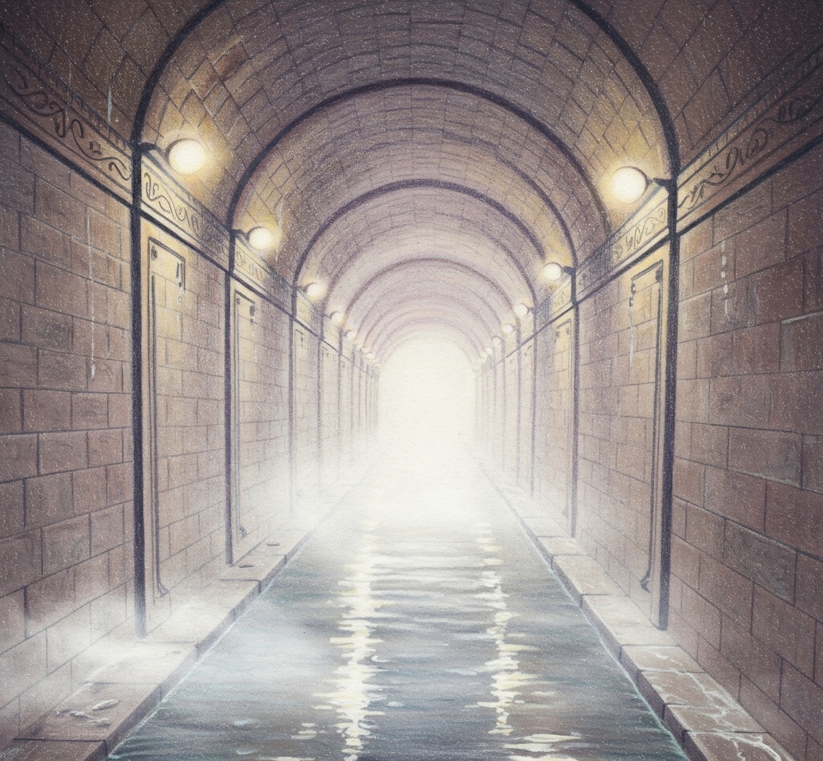 Они бросились вперед, преодолевая сопротивление воды. Маргарет споткнулась и ушла под воду с головой; Джулиан и Уинстон подхватили её, едва не выронив фонарь. Стены туннеля начали сужаться. Воздух становился всё более разреженным, а запах гнили — невыносимым.