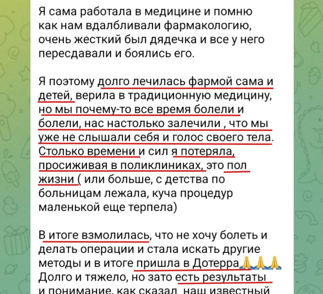 !!🥺 Людмила много лет работала в медицине. Казалось бы, всё должно со здоровьем быть идеально. А на самом деле болезни свои и детей, полжизни в очередях, лекарства, но состояние не становилось лучше❤️🩹 Друзья, знакомо?.. Людмила начала искать другие способы заботы о себе… мягкие, натуральные и эффективные😊 В итоге взмолилась, что не хочу болеть и делать операции и стала искать другие методы и в итоге пришла в Дотерра🙏🙏 Долго и тяжело, но зато есть результаты и понимание, как сказал наш известный врач Амосов: “Врачи лечат болезни , а здоровье надо добывать самому” Здоровье в наших руках - эту мысль поддерживаю на 200%☀️ Друзья, кому откликается, пишите, что бы хотели улучшить по здоровью: 👉 https://t.me/hlistunova_ni Поможем подобрать лучшее решение🙌