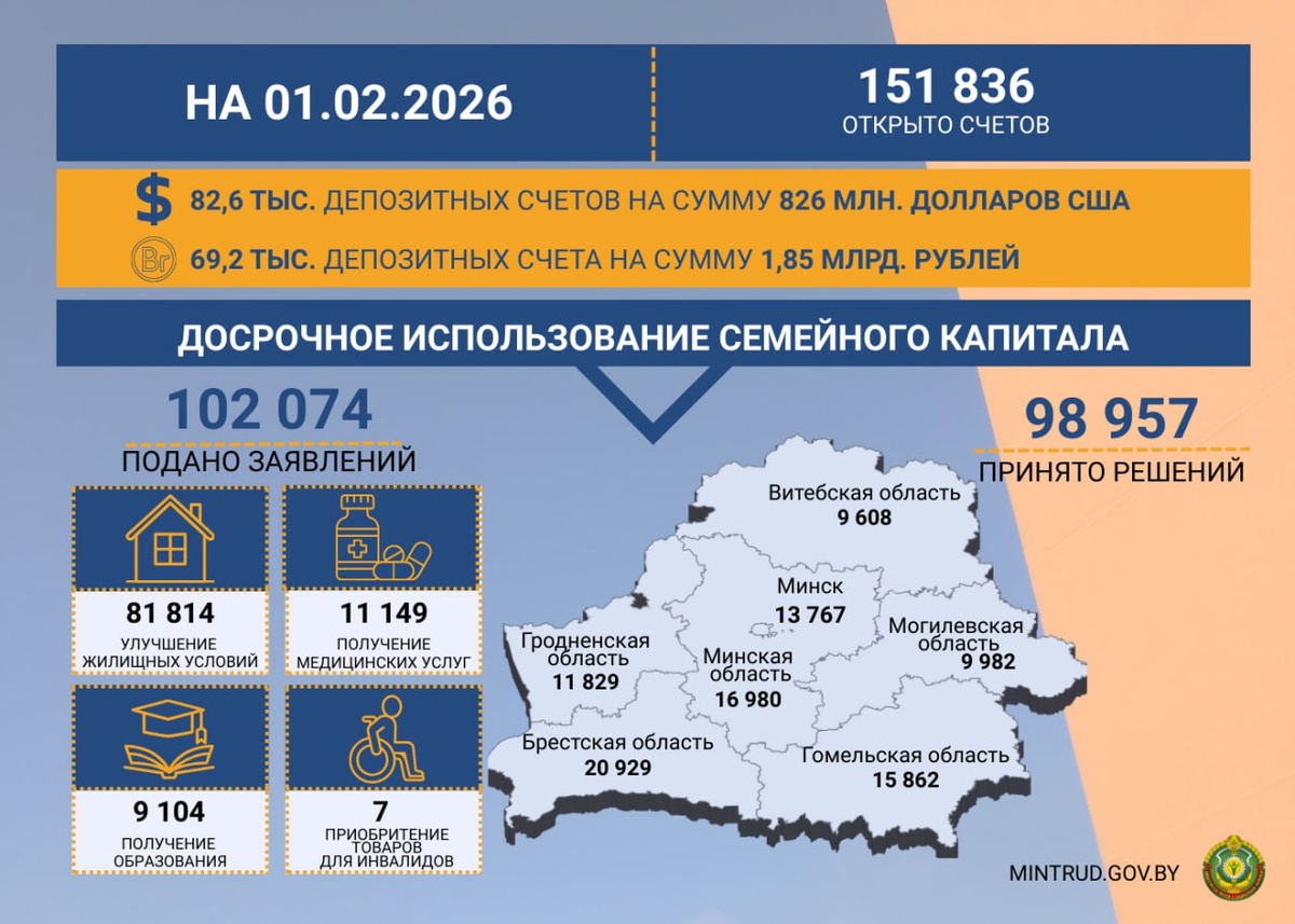 ✍️ Для многодетных семей открыто 151 836 депозитных счета «Семейный капитал»: 🟢82,6 тыс. депозитных счетов на сумму 826 млн. долларов США 🟢69,2 тыс. депозитных счета на сумму 1,85 млрд. рублей 🪙На досрочное распоряжение средствами семейного капитала подано 102 074 заявления. Из них на цели: 🟢улучшения жилищных условий – 81 814 🟢на получение медицинских услуг – 11 149 🟢на получение образования – 9 104 🟢на приобретение товаров для инвалидов – 7. ➖➖➖➖➖➖ 💡Семейный капитал назначается многодетным семьям при рождении (усыновлении, удочерении) третьего либо последующего ребенка. С 1 января 2026 года размер семейного капитала составляет 35 505 рублей. В таком размере семейный капитал назначается семьям при рождении (усыновлении, удочерении) третьего или последующих детей в период с 1 января по 31 декабря 2026 г.