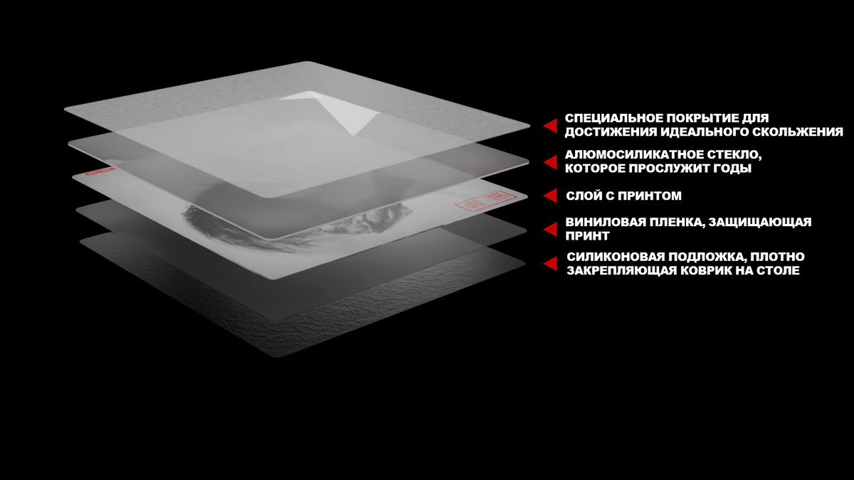 Или как устроены стеклопады и за счёт чего достигается такой уровень скольжения и комфорта при использовании? На первый взгляд это просто кусок стекла с резиновой подложкой снизу. Но на самом деле это многослойная структура, где каждый слой вносит свой вклад в достижение премиальных ощущений. Чтобы понять, почему скольжение стабильное, плавное и быстрое, а коврик не «ездит» по столу, разберём его по слоям — сверху вниз. Самый верх — это не просто стекло, а стекло со специальной обработкой поверхности. Покрытие формирует равномерный микрорельеф, благодаря которому: • Мышь скользит плавно