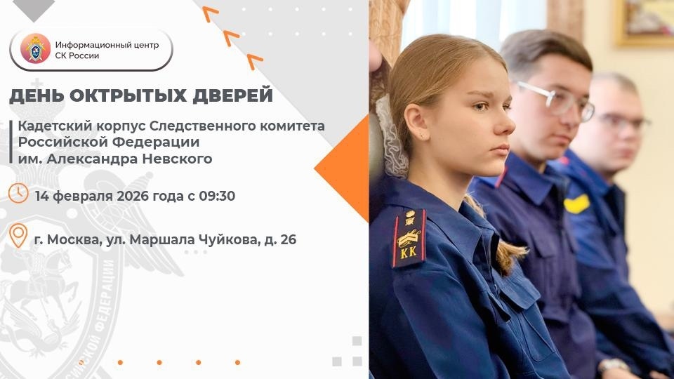 В Кадетском корпусе Следственного комитета Российской Федерации им. Александра Невского пройдет День открытых дверей 14 февраля 2026 года в столичном кадетском корпусе СК России состоится День открытых дверей. В мероприятии примут участие руководство и сотрудники образовательной организации. Все желающие смогут ознакомиться с учебно-материальной базой корпуса и узнать о правилах и порядке поступления. Для участия необходимо прибыть с документом, удостоверяющим личность (паспорт), по адресу: г. Москва, ул. Маршала Чуйкова, д. 26, ближайшая станция метро – «Кузьминки». Для формирования организованных групп участников пропуск будет осуществляться через КПП с 09 час. 30 мин. до 11 час. 00 мин. #СледственныйКомитет #СКРоссии #СК #ИЦСКР #ИнформационныйЦентр