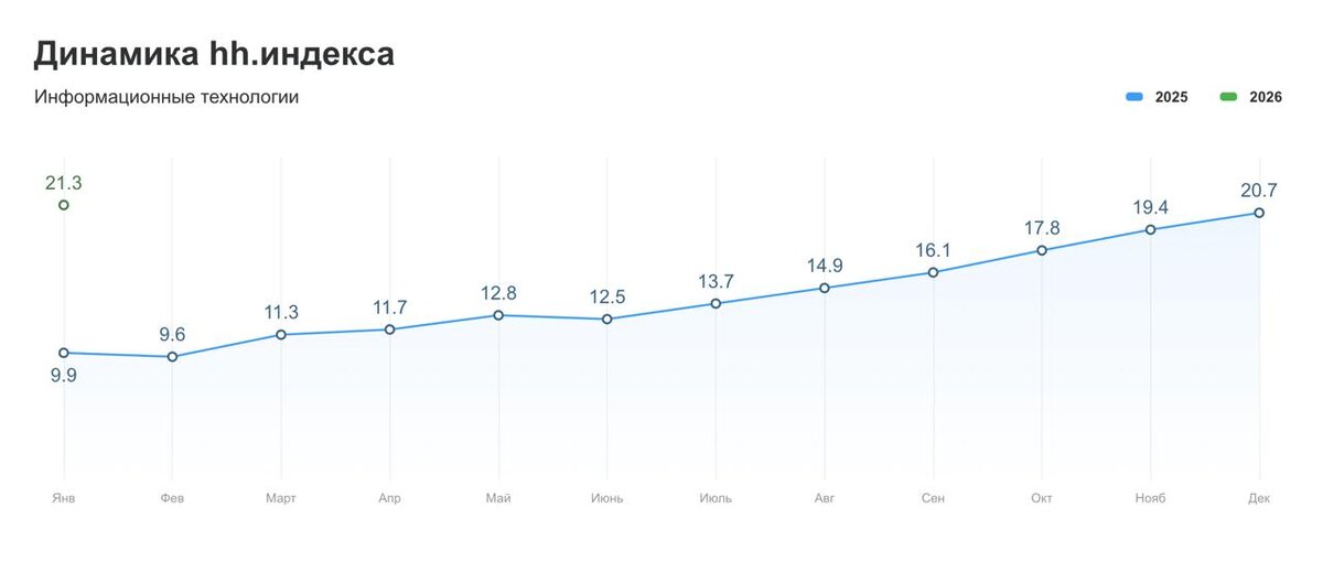 Эпоха «просто разработчиков» закончилась. Пока общая статистика говорит о конкуренции 10 человек на место, в ИТ разворачивается другой сценарий. Я проанализировал свежий отчёт hh.ru и новости рынка: ИТ-сектор первым перешел в фазу «рационального найма». Что происходит в цифрах: Конкуренция (hh.индекс): В ИТ он подскочил до 21 конкуренция за рабочее место продолжает расти. Если вы сейчас работаете, и планируете увольняться, подумайте трижды. Баланс полностью сместился в сторону работодателя. Смерть «масс-маркета»: Компании больше не «пылесосят» джунов и слабых мидлов. Рынок ищет понятных специалистов и тех, кто умеет в сложную инфраструктуру. Что это значит для ИТ-специалистов (без паники): Рынок «разделился»: Есть огромная очередь из тех, кто «просто умеет кодить», и жесточайший голод на тех, кто умеет решать задачи бизнеса. Смена ролей: Теперь не вы выбираете из 10 офферов, а компания выбирает из 10 экспертов. Чтобы пройти фильтры, ваше резюме должно транслировать деньги и резу