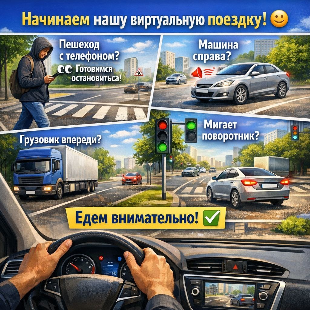 ! ☺️ Смотрите, впереди пешеходный переход — я заранее снимаю ногу с газа и переношу её на тормоз. Видите человека на тротуаре? Он смотрит на телефон... «Что, если он внезапно шагнёт на дорогу, не подняв головы?» 👀 Я готов плавно остановиться. Обратите внимание на иномарку справа на второстепенной дороге 🚗. Водитель может быть невнимателен. «Что, если он выедет, не уступив нам дорогу?» Я чуть отпускаю газ и держу руку на «бибикалке» — профилактика всегда лучше реакции! А сейчас подъезжаем к этому припаркованному грузовику 🚚. Это классическая «ловушка»! «Что, если из-за него выйдет пешеход? Или внезапно откроется дверь?» Поэтому я заранее смещаюсь влево, увеличиваю боковой интервал и снижаю скорость. Видите? Безопасно! 😀 Смотрите, впереди перекрёсток. Зелёный свет, но машина на встречной полосе мигает поворотником... «Что, если она начнёт поворот налево прямо перед нами?» 🤔 Я не ускоряюсь, а, наоборот, контролирую скорость и держу взгляд на колёсах того автомобиля. Так я замечу