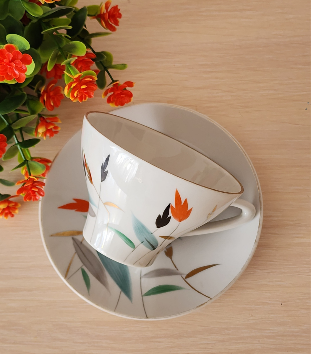 Не менее примечательна на моей чайной паре и роспись. Её автор заслуженный художник РСФСР, художница ЛФЗ Любовь Карловна Блак. Годы создания росписи, начало 60х.