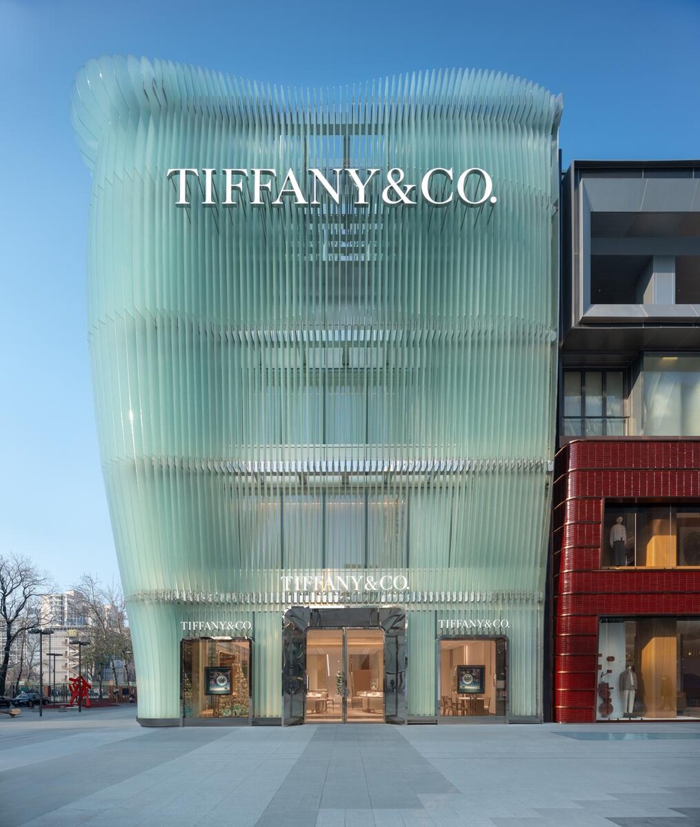 Бутик Tiffany & Co. в Пекине выглядит так, будто здание вырезали из цельного куска бирюзового стекла. 🌷 Вместо обычных витрин - вертикальные стеклянные «лепестки», которые изгибаются и собираются в мягкую форму. Получается эффект полупрозрачной вуали: днем фасад ловит свет и кажется воздушным, а вечером начинает светиться изнутри - без видимых ламп и прожекторов. Дизайнеры вдохновлялись украшениями Эльза Перетти - поэтому линии не строгие, а пластичные, почти ювелирные по характеру.💎 Хороший пример того, как бренд можно узнать не по логотипу, а по силуэту здания.