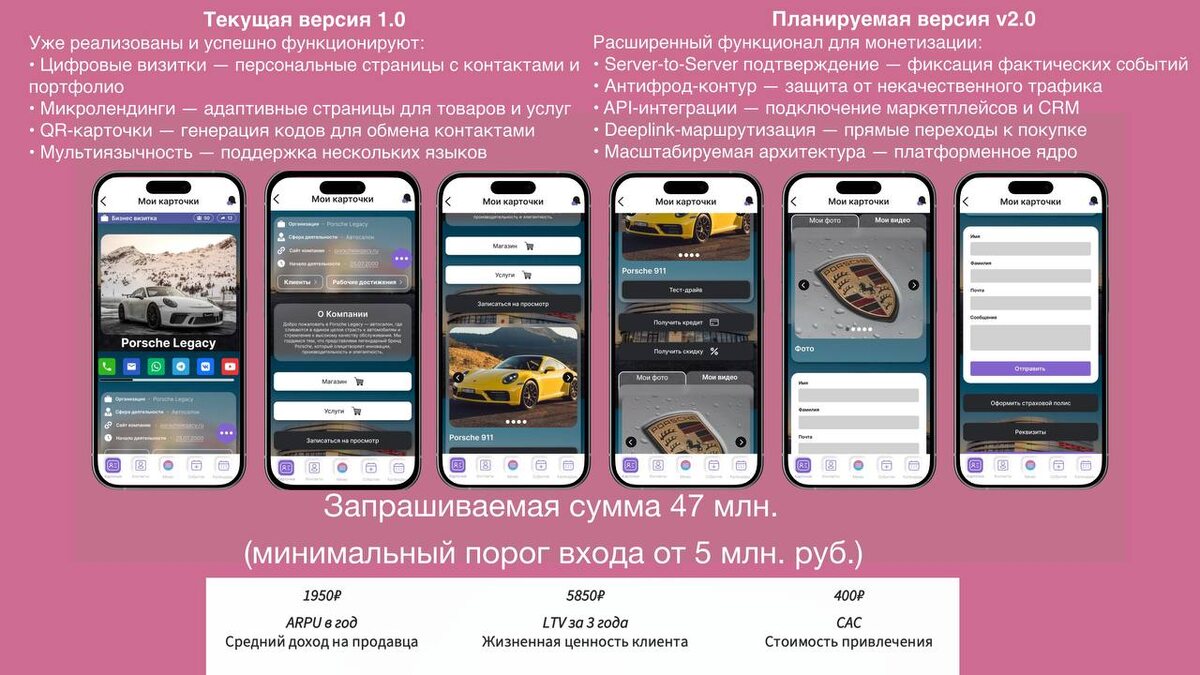 ! Lumakonica 2.0 — цифровая платформа мультипрофильных микролендингов с интеграцией в маркетплейсы и партнёрские сети. О проекте: Lumakonica — это технологическая платформа, которая превращает разрозненные клики из соцсетей, рекламы и офлайн-активностей в управляемые продажи с подтверждённым результатом. Мы не просто создаём лендинги — мы помогаем бизнесу не терять клиентов на пути от первого клика до покупки. Наши достижения: - Успешно разработана и запущена версия 1.0 подтвердившая гипотезу о востребованности сервиса - более 4000 пользователей - ежемесячный органический прирост пользователей 250-350 чел./мес. (без рекламы) - Участник инновационного центра «Сколково». - Член Московского инновационного кластера (МИК). * Сколково и МИК предоставляют возможность возврата 50% инвестиций частному инвестору - Включен в реестр стартапов и высокотехнологичных компаний г. Москвы Инвестиционная потребность: 47 млн. руб. Условия сделки: 25% доли компании. Нотариальное оформление через и
