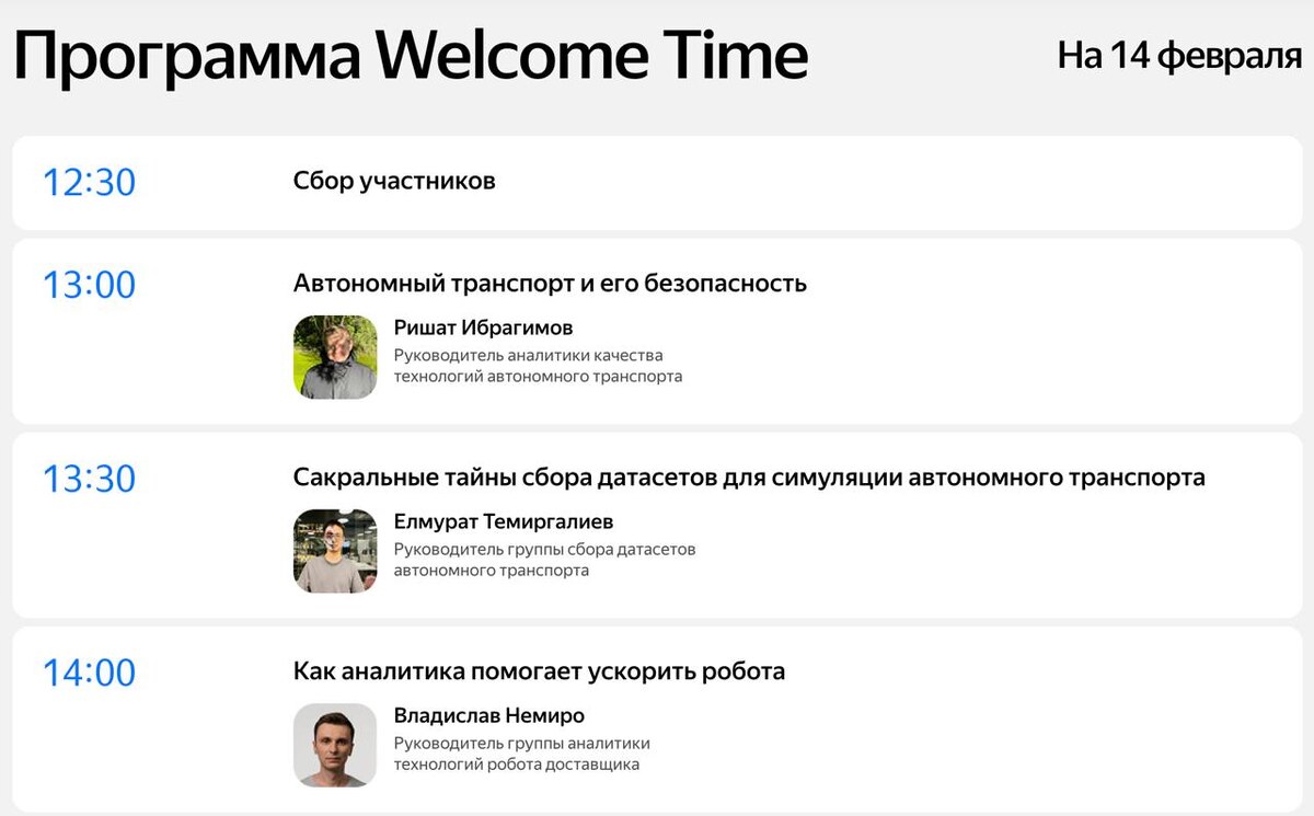 Ищу: - двух бодрых аналитиков с инженерным бэкграундом: не боятся писать на питоне, читать С++, уметь тестировать код - одного бодрого бэкенд-разработчика, чтобы делать инструменты аналитики, сложные визуализации, развивать движок написания метрик и делать из него внутренний продукт Концептуально задачи про: методологии и инструменты оценки безопасности вождения. Как будут вакансии – скину. Пока просто пишите мне @martsen . Обзор того, чем и с кем предстоит заниматься можно получить в эту субботу на Welcome Time (доклады на скриншоте): https://yandex.ru/project/events/welcometimes-all
