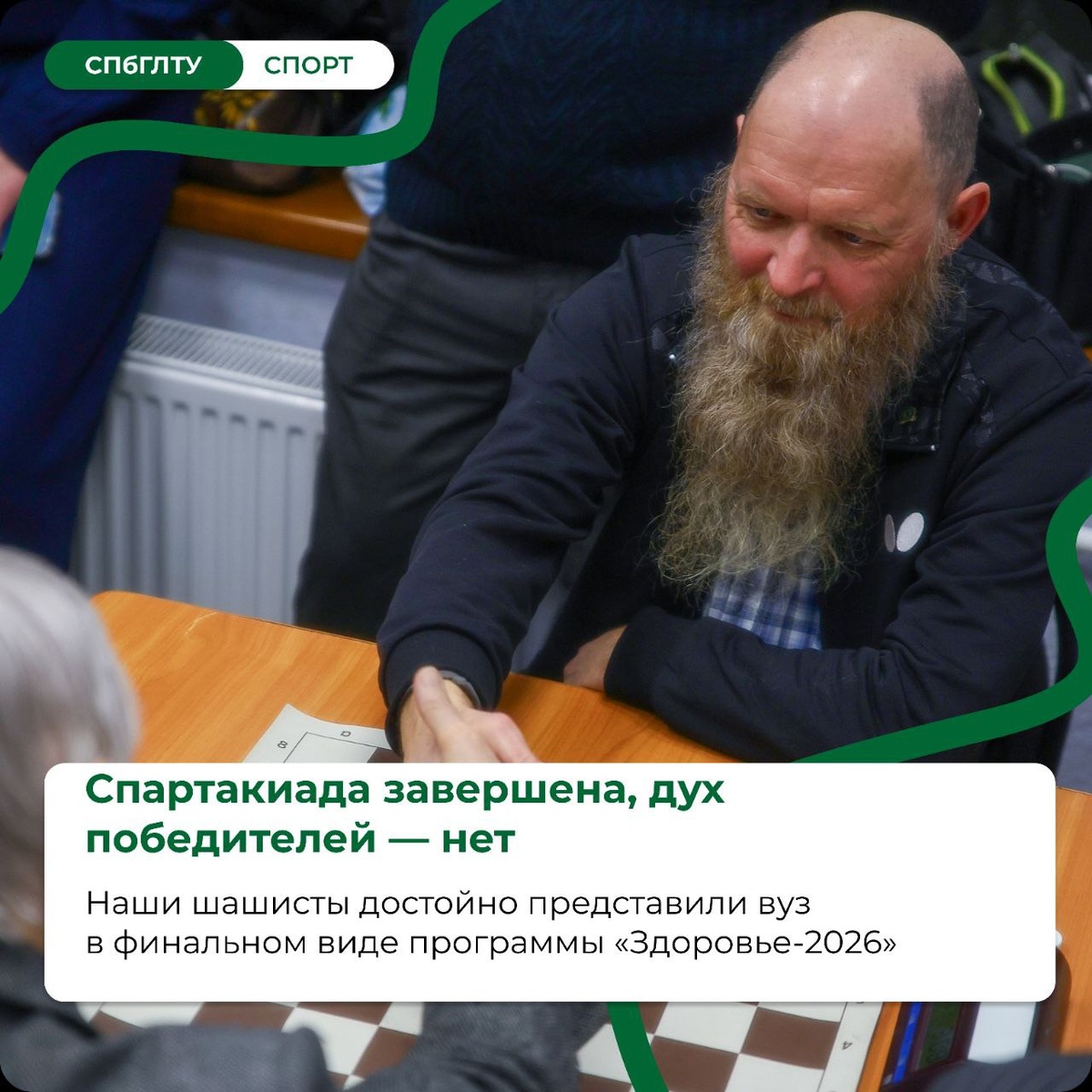 ! В минувшие выходные завершилась спартакиада «Здоровье-2026» для сотрудников вузов Санкт-Петербурга. Заключительным видом соревнований стали шашки. Нашу команду представляли: ♟️ Переверткин Николай ♟️ Новикова Мария Мы гордимся вашим спортивным духом, достойной игрой и тем, как вы представили СПбГЛТУ на заключительном этапе спартакиады! 🐺💚 Спартакиада завершена, но дух соперничества и любовь к спорту в нашем коллективе остаются! До новых стартов! #СПбГЛТУ #СПбГЛТУ_спорт 👻 МАХ | 📲 ВК | 📝 ДЗЕН