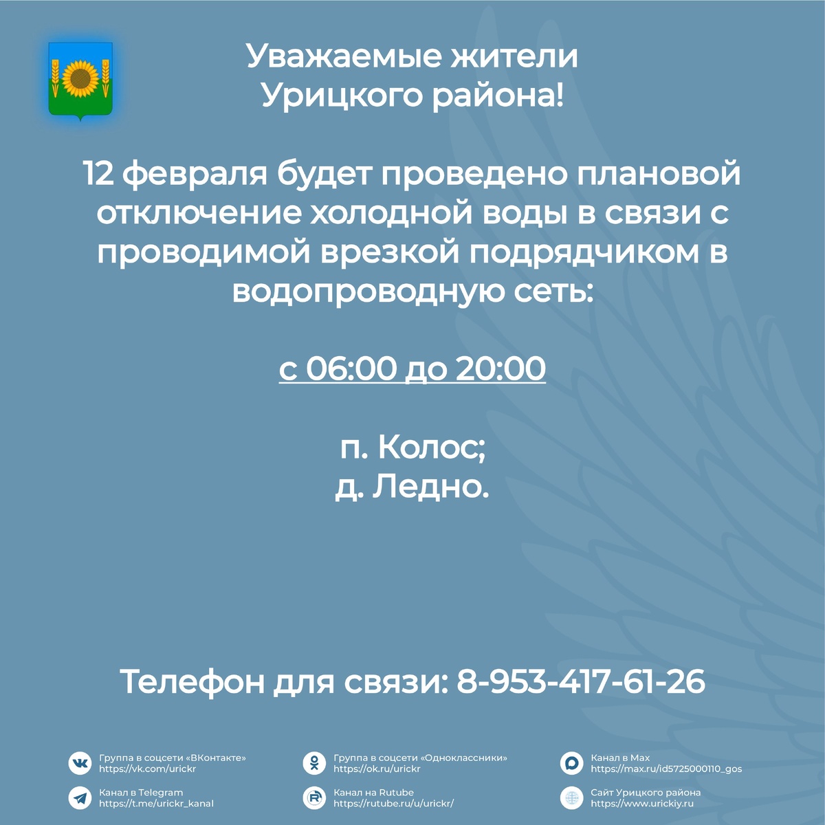 ! 📢 12 февраля будет проведено плановое отключение холодной воды в Урицком районе. Все подробности в карточке ⬆ #УрицкийРайон #АдминистрацияУрицкогорайонаОрловскойобласти