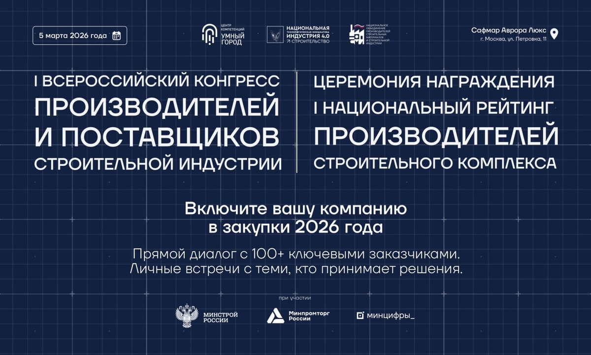 5 марта в Москве состоится I Всероссийский конгресс производителей и поставщиков строительной индустрии. Конгресс объединит более 500 руководителей и топ-менеджеров отрасли, в числе которых ЛПР крупнейших российских застройщиков, генподрядчиков и госзаказчиков: ⬇️ГК ФСК, ГК «КОРТРОС», Sezar Group, GloraX, ГК «РКС Девелопмент», «ДОГМА», ПАО «Северсталь», ГК «Самолет», ГК «Спарта», ГК «Железно», ГК «Нацпроектстрой», «СтройСити», «ПСК МАГИСТРАЛЬ КОНСТРАКШН», «ЮСстрой-20», «Неометрия», ГК «Основа», «Айкон-Девелопмент», ГК «Элемент», «Апсайд Девелопмент» и многие другие. На мероприятии производители и поставщики строительного комплекса: 🔵 Смогут наладить прямой контакт с руководителями закупок и тендеров крупнейших строительных компаний без посредников и формальных барьеров. 🔵 Получат персональную обратную связь по продукту, решению или технологии от заказчиков федерального уровня. 🔵Узнают реальные потребности и точные критерии отбора заказчиков перед стартом нового закупочного цикла.