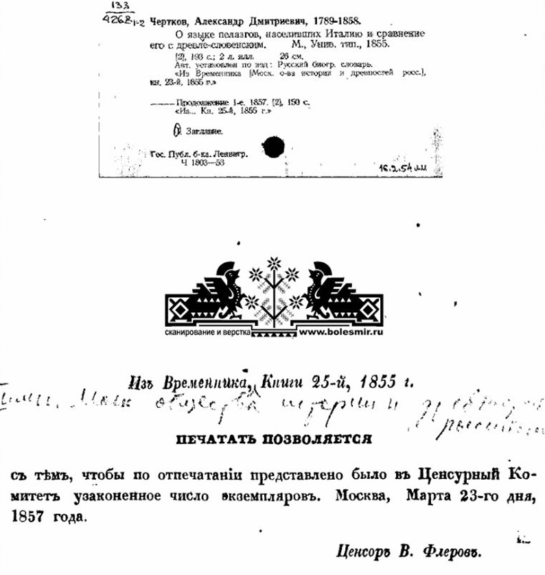 Для объяснения надписей пелезгов прибегали к помощи языков: еврейского, ефиопского, египетского, арабского, коптского, кельтского, англо-саксонского, рунического и даже китайского. В истолковании этрурских надписей ученые дошли только до исправленной азбуки и прочтения собственных имен. По произношению имена сходны со словенскими. Прозвища мужчин оканчиваются зачастую на an, un. Примеры мужских имен Arun, Laran, Nusan, Turan. Женские имена оканчиваются на a, na. Примеры женских имен Velia, Verna, Husina, Una.