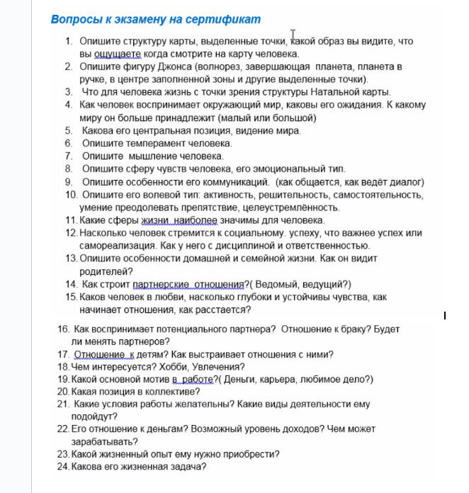 Что такое? Нет, не блокировка и не замедление ТГ. Хотя с этим тоже полный привет, хорошо что вела параллельно Дзен и ВК. А мандраж потому, что идет последнее полугодие со сдачей экзаменов. Я заканчиваю 4 курс Московской Академии Астрологии (МАА), и уже сейчас начинаются письменные и устные сдачи экзаменов. Это выглядит как вопросы по натальной карте, на которые мы будем отвечать. Вопросы посмотрите какие - 24 шт. За это полугодие мы их все постепенно сдадим. На 1 курсе эти вопросы казались чем-то из области фантастики. Как можно по карте рождения это все распознать? А оказывается можно. Вот нас и будут экзаменовать. А ведь у меня параллельно идет еще один курс по Эволюционной Астрологии с М.Б.Левиным, и там тоже задания все сложнее и объемней. Хорошо хоть, что не будет экзамена по прогностике - дирекции, прогрессии, соляры и тд (уже были зачеты). Нам и натальной карты хватит за глаза. На ее изучение уходит больше всего времени и сил, и это самое сложное что есть, это живой человек