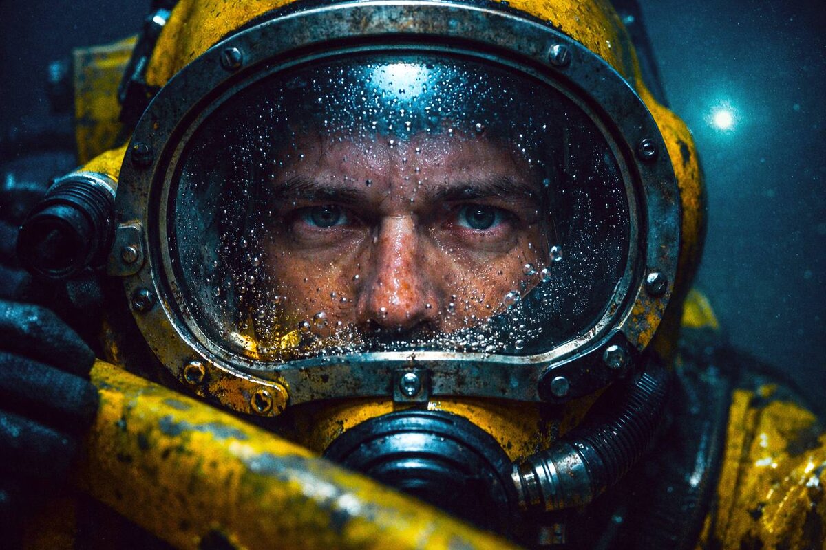 Темнота на дне Северного моря — это не просто отсутствие света. Лемонс не различал собственную руку перед лицом шлема. Огромная ярко-жёлтая конструкция, двадцать метров в длину, могла быть в двух шагах от него, а могла быть в ста. Или в другой стороне. Без фонаря, без ориентиров, без голоса в наушнике он был потерян так же, как человек, выброшенный в открытый космос.