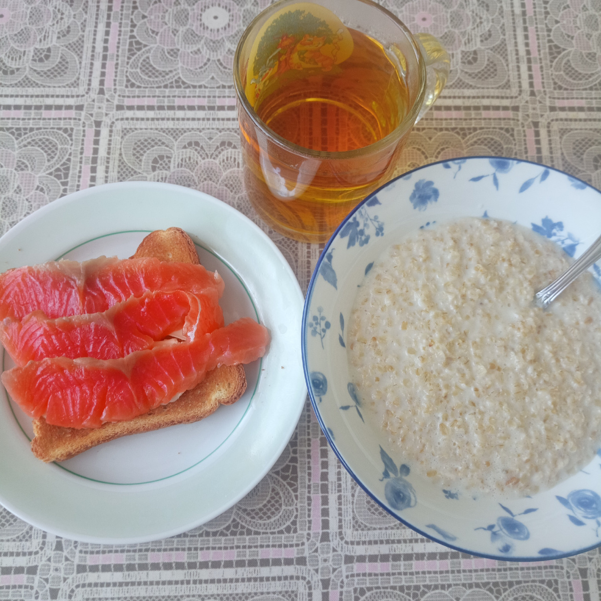 Мой завтрак. Пока есть рыбка, делаю каждое утро бутерброд. Ну и, конечно, каша. Стала заваривать шиповник на ночь в термосе. Получился, правда, бледноватый, но кисленький, значит витамины присутствуют.