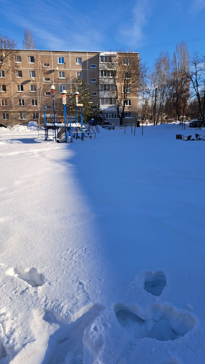 На фото видна высота снежного покрова, не скажу, что совсем такого никогда не было, но и не как в прошлом году. С мамой недавно разговаривали и я вспоминала, какие высокие раньше сугробы были, выше меня же! Идешь в школу между ними, как в тоннеле! А мама мне и говорит: