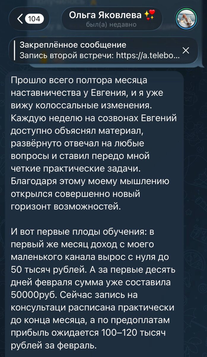 ? Вы просто что-то делаете не так) Вот сегодня получил отзыв от Ольги Она пришла ко мне в работу в начале января: - 250 подписчиков - был неудачный опыт работы с наставником - доход с канала 0 последние 8 месяцев Большинство бы решило, что 100% нужно набирать новую аудиторию. Но мы выбрали путь проще — заработать деньги, и уже их вкладывать в продвижение Я помог разобраться с тем, как получить максимум заявок с канала, как презентовать свои услуги и продавать Итог видите на скринах 👆 И всё это на ту же самую аудиторию, которая молчала 8 месяцев) Без понимания продаж нет смысла увеличивать количество подписчиков, они сами у вас не купят) Накидайте 🔥 Ольге