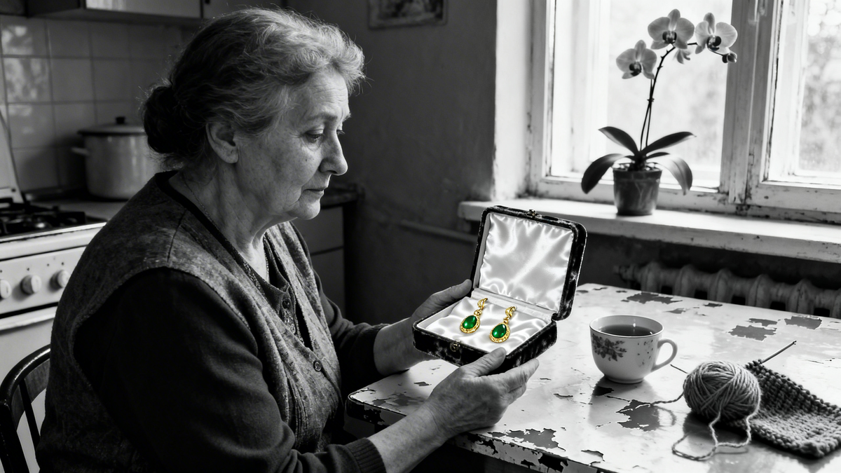 Она открыла комод, достала шкатулку. Сдвинула салфетки, вынула бархатную коробочку. Серёжки лежали на белом атласе, две зелёные капли в золотых оправах. Она взяла одну, поднесла к свету. Камень загорелся изнутри, заискрился.
